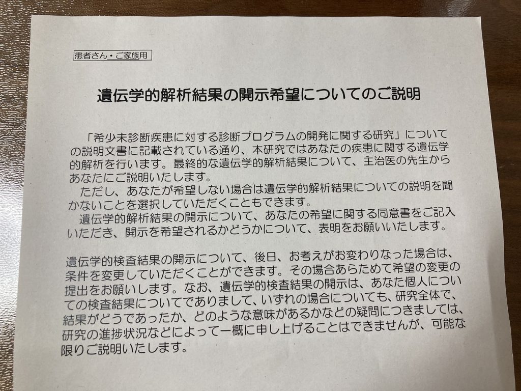 もちろん、検査を受ける前に誓約書を書くのですが、どこまで開示していいか、夫には自分(妻)の結果を伝えたくない、原因遺伝子を特定したとしても、両親どちらの遺伝子か?までは言って欲しくないなど細かく聞かれます。